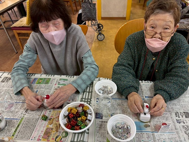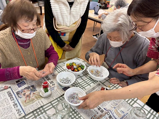 12月の創作レクリエーションでは、スノードーム作りを行いました。