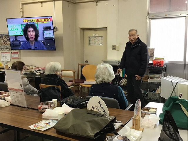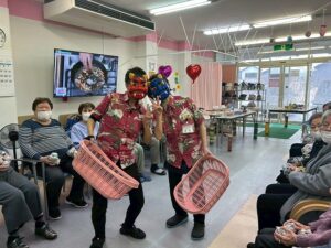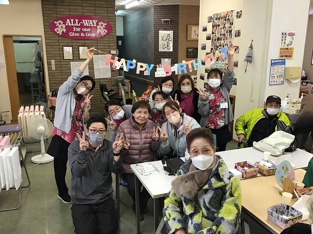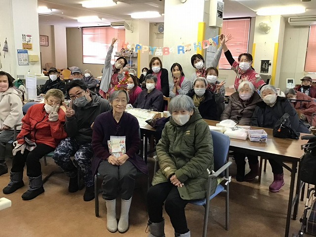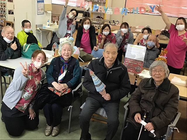 最後にその日の主役をご紹介し、ささやかながらプレゼントをお渡しします。スタッフや仲の良いご利用者様とともに記念撮影を行い、感謝の気持ちを込めてご挨拶されるお姿に、会場はたくさんの笑顔に包まれます。